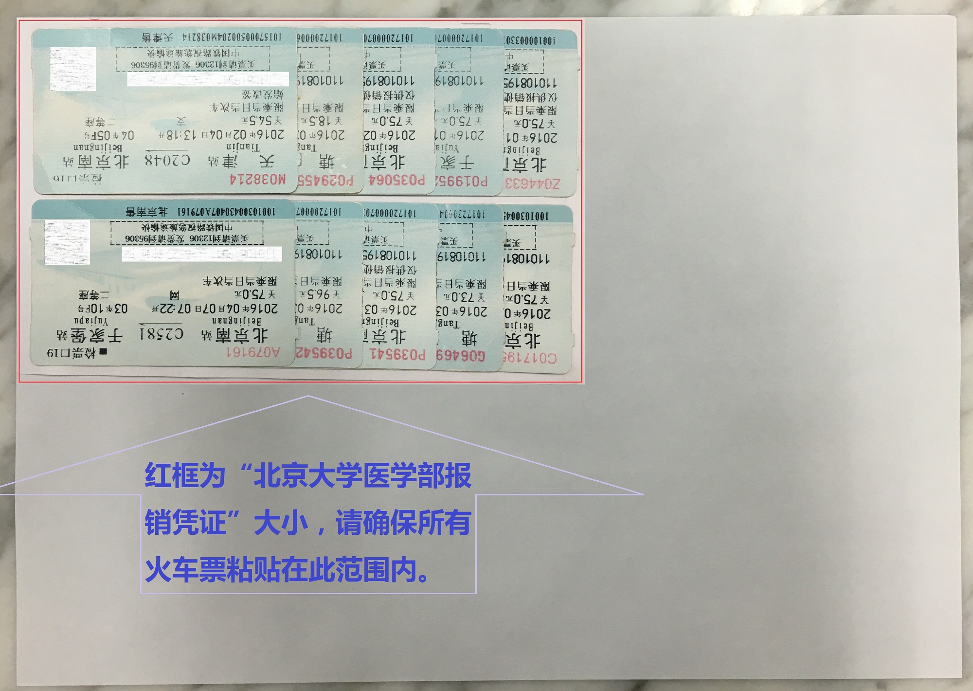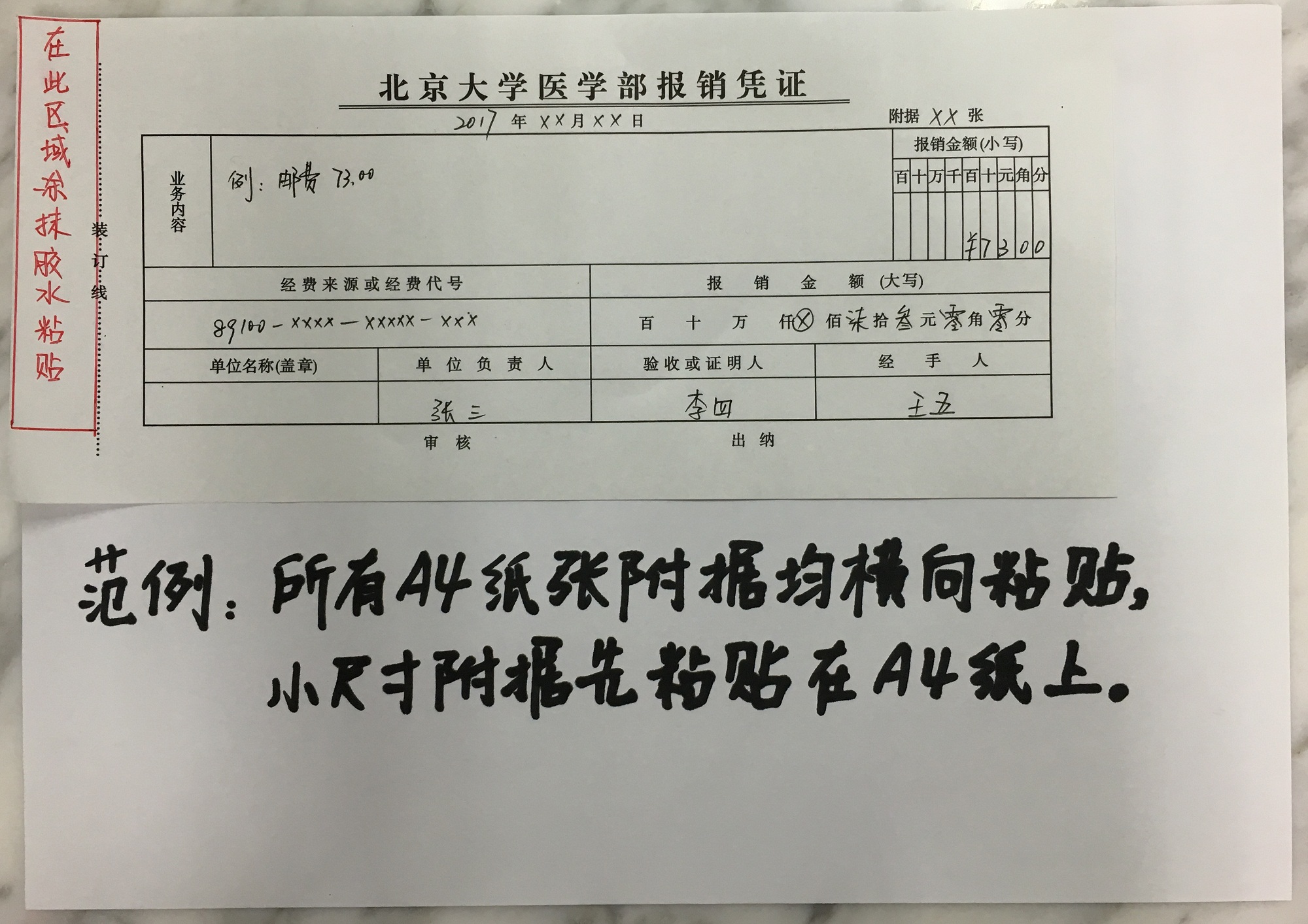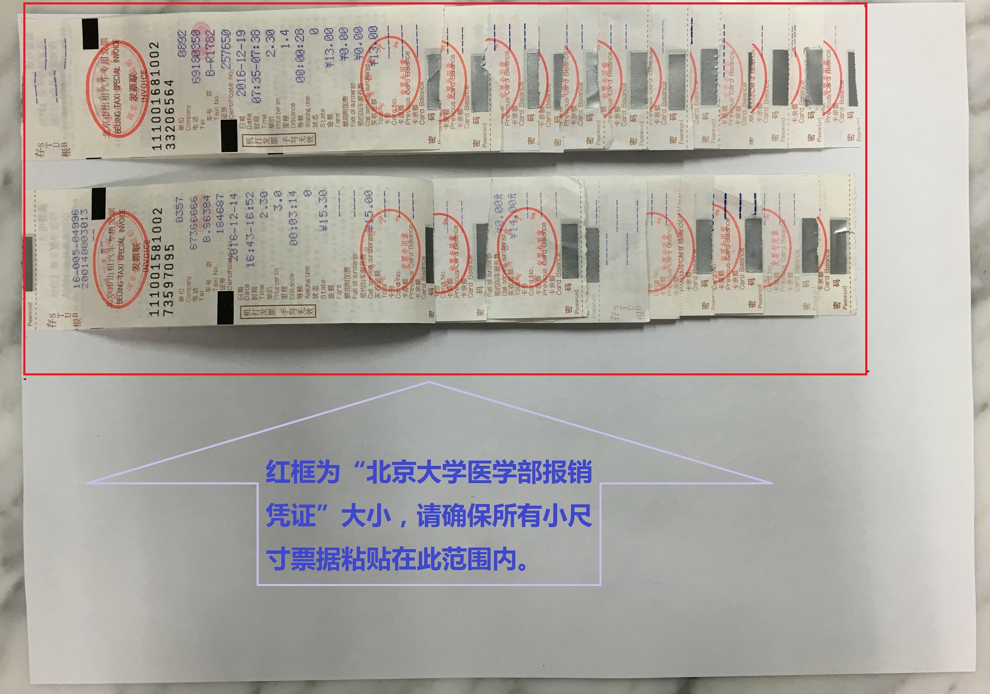 (4)将尺寸小于A4纸的票据均匀的粘贴在横向A4纸张上,自左至右以鱼鳞式粘贴票据,每张票据要贴在A4纸上,不要以票贴票,不要集中在中间粘贴,尽量厚薄均匀,保证所有票据不要超过“北京大学医学部报销凭证”纸张大小。
