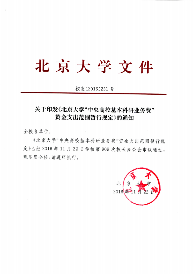 校发【2016】231号关于印发《北京大学“中央高校基本科研业务费资金支出范围暂行规定》的通知.pdf